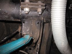 Leider stört beim Einbau nun die Getriebegabel mit dem Bügel. Also müsste dieser rausgetrennt und eine neue Motoraufhängung geschaffen werden. Diese wird wie beim T2 am Motor oder Getriebe und am Rahmen angeschraubt. Leider passt die originale Aufhängung vom T2 nicht ohne Änderung, da die zweite Busgeneration einen breiteren Rahmen hat.