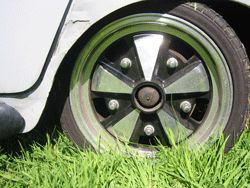 Für die Bremse braucht noch die gesamten Bremsteile vom Typ1, sowie einen 19mm Radbremszylinder. Die Bremstrommeln sind extra geänderte Bustrommeln vom T1 bis Bj.7/63, also der mit der 0,8t Achse. Man kann natürlich seine alten Trommeln ändern lassen, wenn man weiß wie. Ansonsten kann man dies auch im entsprechenden Fachhandel beziehen. Das nächste Problem das nun auftritt ist, die Bremsankerbleche müssen nun seitenverkehrt und auf dem Kopf angebracht werden, da sich die Handbremsseile sonst nicht einbauen lassen (jedenfalls nicht ohne sie total zu verspannen). Wer etwas von der Materie kennt, hat bestimmt bemerkt das die Radbremszylinder auf dem Kopf stehen und sich jetzt nur schwer entlüften lassen. Mit einem Bremsenentlüftungsgerät bekommt man dieses Problem eigentlich ganz gutin den Griff. Als letzte Teil gibt es jetzt nun noch zwei kleineRöhrchen mit, mit denen sich die Längenunterschiede der Handbremsseilführungen (Bowdenzughüllen) ausgleichen lassen. Alles in allem ist dieser Umbausatz sehr aufwendig, wenn man bedenkt das man danach immer noch eine Pendelachse fährt, die nicht gerade durch ihr Fahrverhalten glänzt. Außerdem muss eine unterschiedliche Reifengröße gefahren werden, da der Wagen sonst hinten tiefer ist als vorne, obwohl die Vorderachse schon auf dem letzten Zahn steht. Sofern eine höhenverstellbare Achse eingebaut ist. Zu dieser später mehr. Außredem ist es zu empfehlen, einen verstärkten Radbremszylinder von min 19mm einzubauen, damit man mit der Käferbremse auch genügend Bremsdruck hat. Nachteile sind wie gesagt eine kleine Bremse hinten und bei nicht extremer Tieferlegung einen positiven Sturz an der Hinterachse.