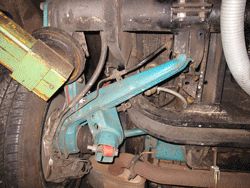 Die Stoßdämpferaufnahmen sitzen beim T2 an den Schräglenkern sehr weit hinten, d.h. neue Stoßdämpferlager müssen oben am Längsträger angebaut werden. Ambesten geht dieses an der Stelle wo das Ablaufrohr vom Tankstutzen rauskommt. Hier das Blech Innenradlauf etwas entfernen und dort die Aufnahmen mit ca. 15mm Abstand vom Träger anschweißen oder schrauben.